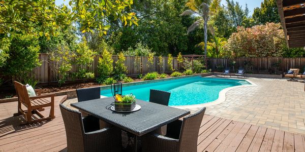 The sun-swept rear yard with sparkling pool and arbor-covered lounge.